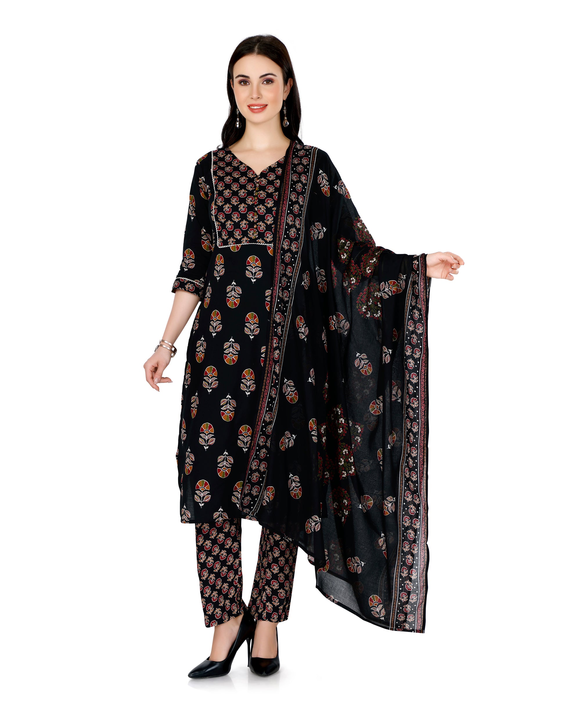 Black Ethnic Motif Printed V-Neck Kurta Set with Dupatta